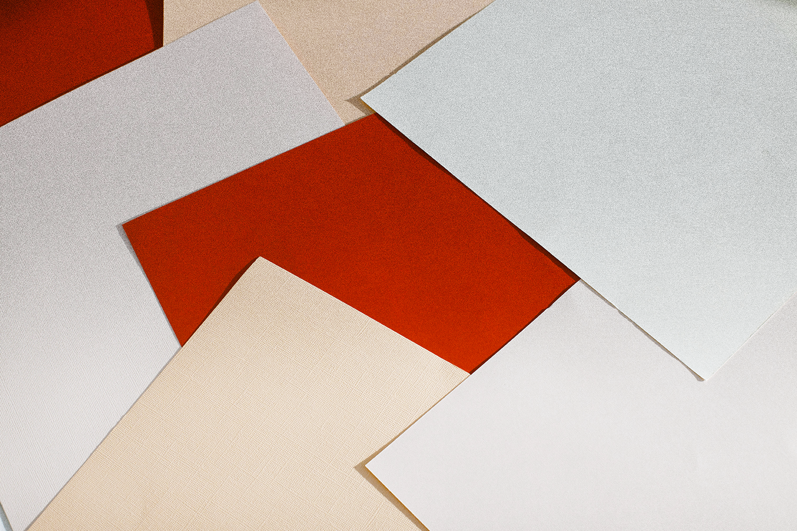 An assortment of colored paper sheets arranged overlapping on a surface, including white, beige, red, and light gray sheets.